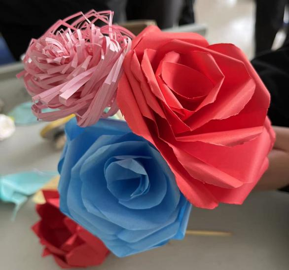 同学们发挥想象力,用五颜六色的折纸,根据小视频和分发的工具制作玫瑰花,制作完成后志愿者们将玫瑰花赠予为我们默默奉献的人,为他们送上美好的祝福,用纸花传递温暖,分享爱与喜悦,传递美好与浪漫。不论是宿管阿姨还是餐饮阿姨在收到花时,幸福喜悦的笑容都不由自主地绽放出来,活动现场弥漫着一股爱的暖流。