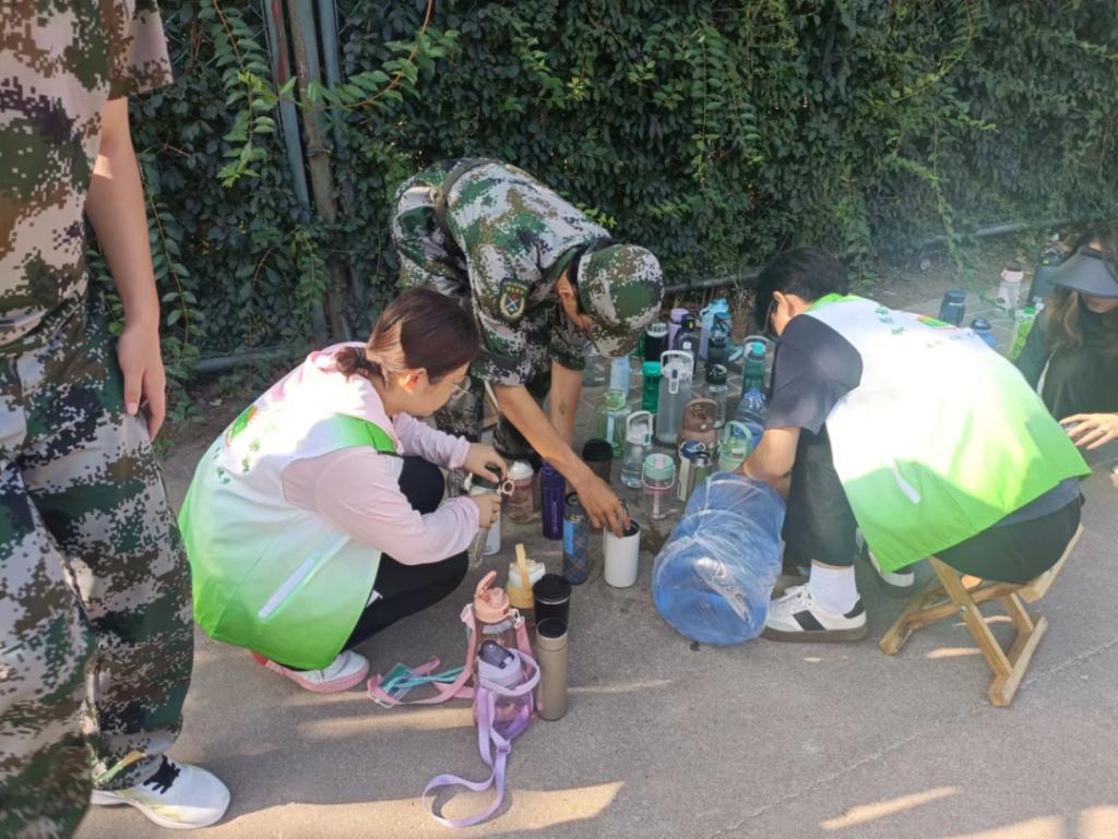 党员志愿者们每日都早早来到军训场地,准备好水、防暑物资、应急药品,直到夜晚训练结束后,清理场地,保证环境整洁。纵然衣衫尽湿,亦不忘服务初心,弘扬“奉献、友爱、互助、进步”的志愿服务精神,努力成为新生学子们和教官最坚强的后盾。 军训期间,党员志愿者们忙碌的背影始终穿梭在军训场地,时刻关注新生的训练状况,耐心倾听同学们的需求,主动为同学们提供服务,遇到突发情况紧急处理,用最朴实的行动传递最纯真的关心。