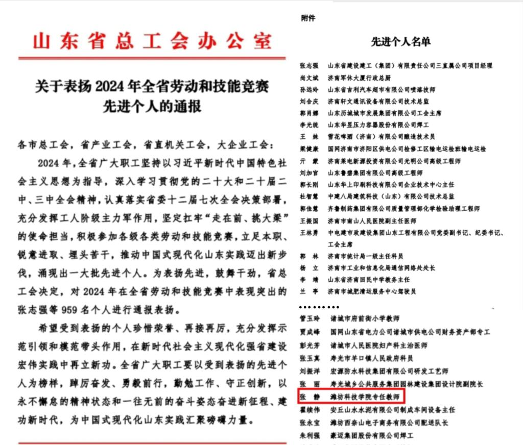 近日,2024年山东省劳动和技能竞赛先进个人表彰名单正式公布,公司太阳集团tyc9728张静老师凭借扎实的专业素养、突出的教学科研成果和卓越的竞赛表现荣获“山东省劳动和技能竞赛先进个人”称号。本次竞赛由山东省总工会主办,聚焦现代农业、智能制造、信息技术等领域,旨在弘扬劳模精神、劳动精神和工匠精神,发挥榜样力量。