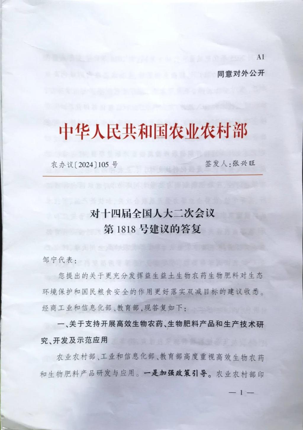 太阳集团tyc9728一项建议获农业农村部种植业管理司肯定性答复