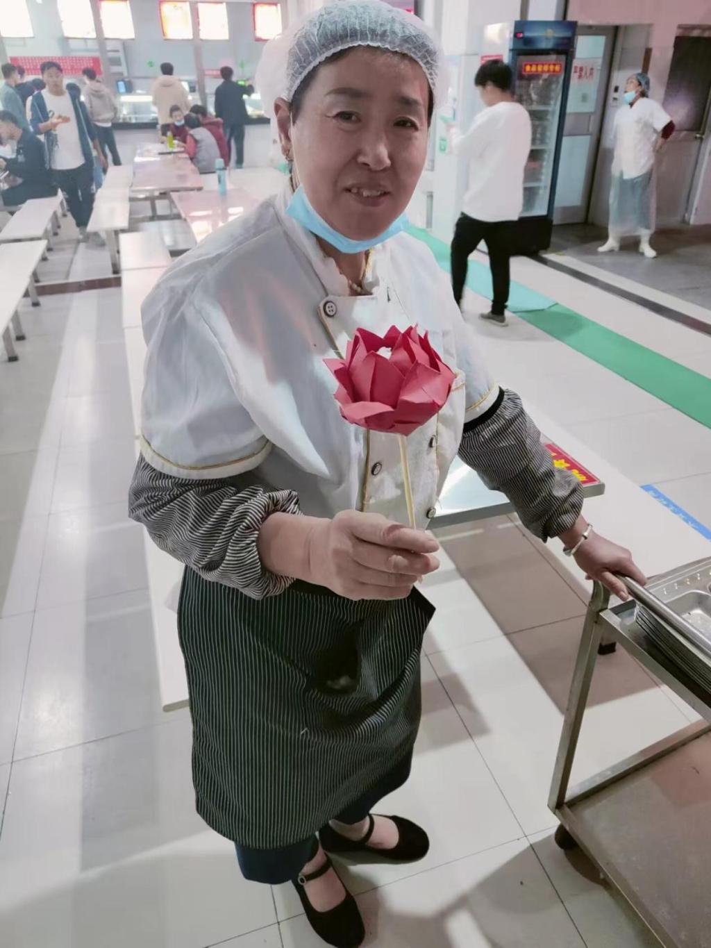 同学们发挥想象力,用五颜六色的折纸,根据小视频和分发的工具制作玫瑰花,制作完成后志愿者们将玫瑰花赠予为我们默默奉献的人,为他们送上美好的祝福,用纸花传递温暖,分享爱与喜悦,传递美好与浪漫。不论是宿管阿姨还是餐饮阿姨在收到花时,幸福喜悦的笑容都不由自主地绽放出来,活动现场弥漫着一股爱的暖流。