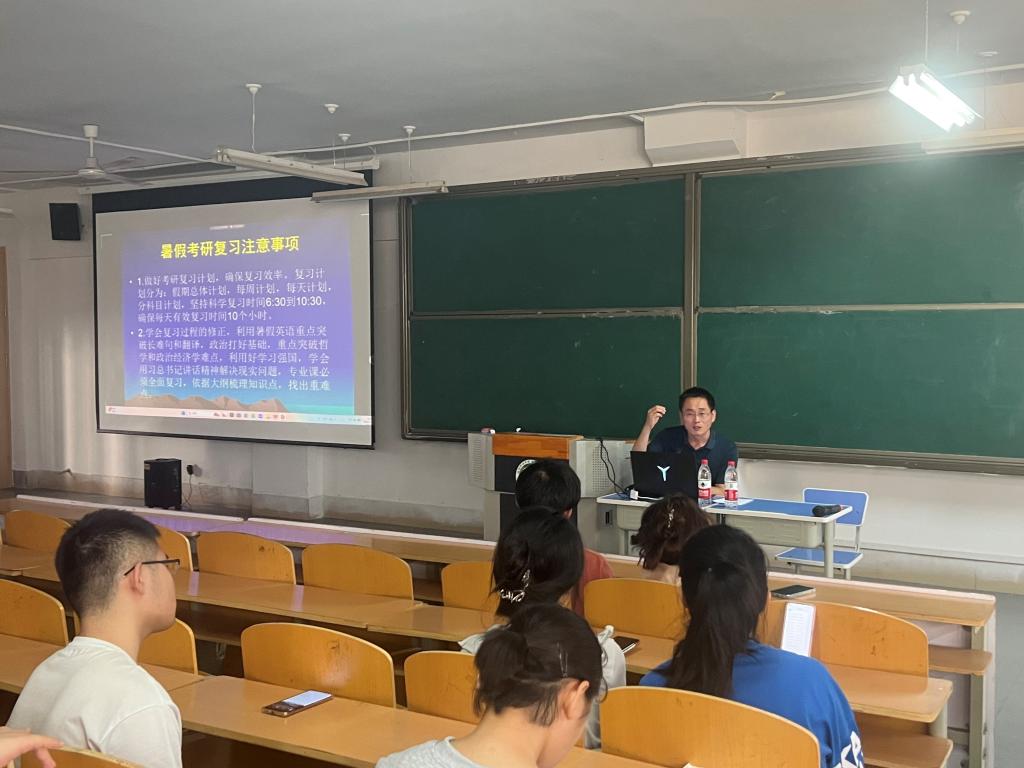随后,党支部副书记、考研负责人李建永老师对暑期考研进行专题讲座。李老师首先分享了农公司18级和19级优秀毕业生暑期考研复习经验和他们对20级考研学弟学妹们的寄语,希望同学们坚定考研信念,明确暑期留校意义。接着李老师从三个方面坚定同学们的考研决心:第一,把握好暑假黄金学习期。希望同学们珍惜暑期留校学习时光,对考研公共课和专业课进行全面系统复习,梳理基础知识点,攻克重难点;第二,关注考研动态,掌握科学备考方法。时刻关注报考公司的考研动态,制定合理的复习计划,科学分配学习时间,复习时注重融会贯通总结;第三,正确处理好学习与生活的关系。考研考的不仅是智商,还有信心、恒心和毅力,希望同学们保持健康心态,严格自律,学会劳逸结合,静下心来努力学习。最后,李建永老师强调:“理想坚定、信念执着、坚持不懈、不畏困难,是考研成功的关键。”希望农公司全体考研学子敢拼、敢闯,不负青春,不负韶华!