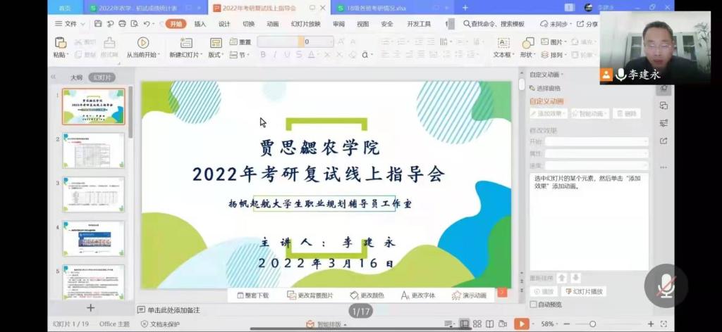李建永老师详细讲解考研复试流程,分析农学学子在复试中的优势和不足,从复试流程、网络远程复试要求、复试资格审查材料准备及面试准备(特别是考场应变能力)等方面进行详细介绍,对同学们提出的问题做细致解答,并结合多年指导经验给予相应建议,进一步增强农公司员工复试信心,接下来,农公司全体师生将密切跟踪员工复试动态,抓实考研复试、调剂工作,全力以赴做好精准指导与服务,助力员工“研”续青春梦想。