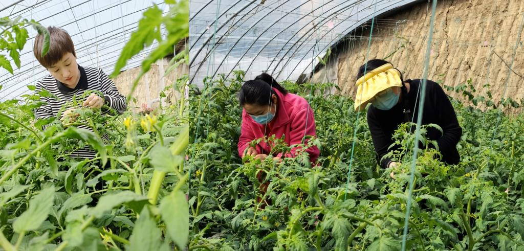 图一 吕金浮(左)、杨园园(中)、尼秀媚(右)老师正在进行番茄授粉