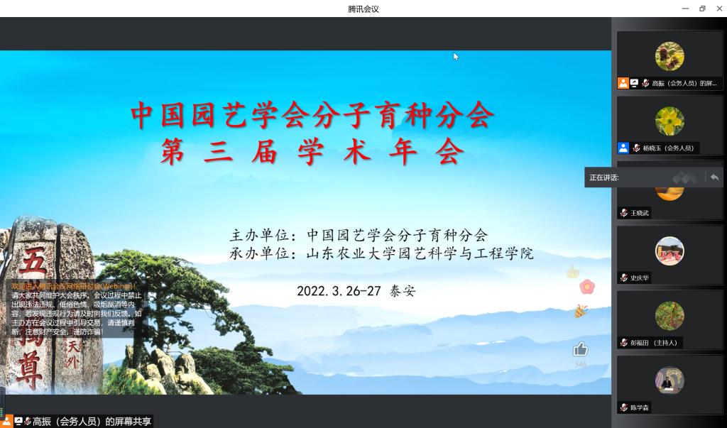 326-27日,中国园艺学会分子育种分会第三届学术年会通过线上直播举行,本次会议由中国园艺学会分子育种分会主办,山东农业大学园艺科学与工程公司承办。大会历时两天,邀请了院士、长江学者、杰青、现代农业产业体系首席科学家和岗位专家等国内外知名专家做了46场精彩的报告。