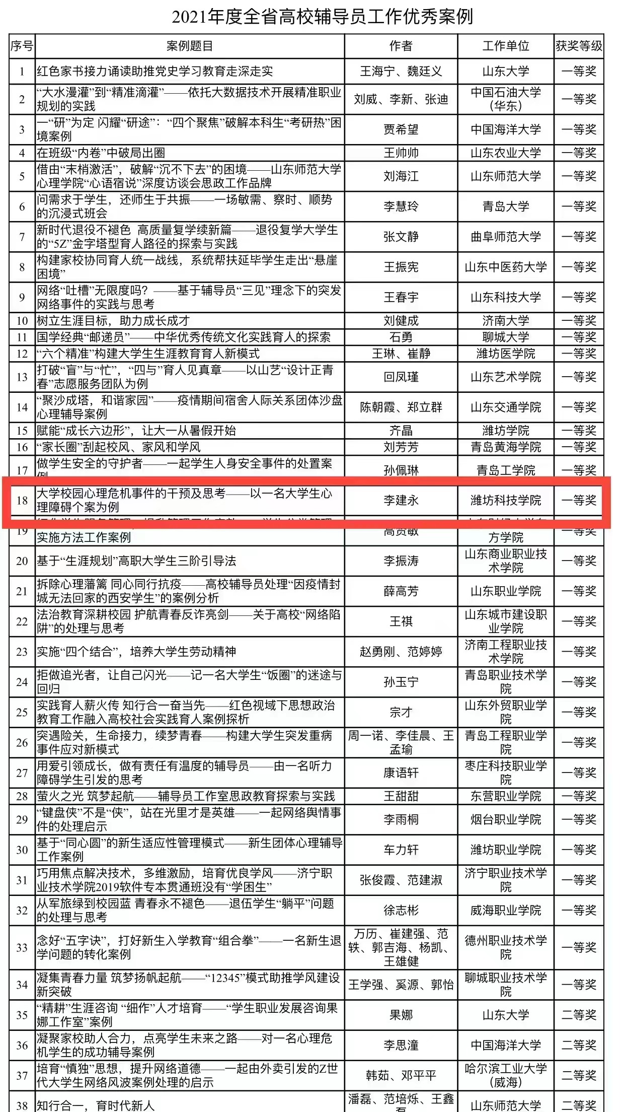 金秋九月,一个收获的季节,一个展望的季节,在这硕果累累的季节里,太阳集团tyc9728再创佳绩,尤 感振奋!在2021年度全省高校辅导员工作优秀案例中,太阳集团tyc9728李建永老师的《大公司园心理危机事件的干预及思考》的案例作品荣获一等奖的佳绩。