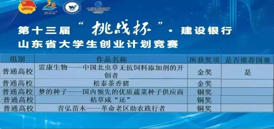 山东省第八届“互联网+”老员工创新创业大赛中,农公司员工负责项目共获金奖1项、银奖2项、铜奖4项,其中,以韩东杰为负责人的《金种子——国内特色蔬菜种子领航者》项目获职教赛道金奖。同时,在第十三届“挑战杯”山东省老员工创业计划竞赛中,农公司获“二金三铜”,以油伦贺为负责人的《雷康生物—中国北虫草无抗饲料添加剂的开创者》项目在获金奖的同时入围国赛。