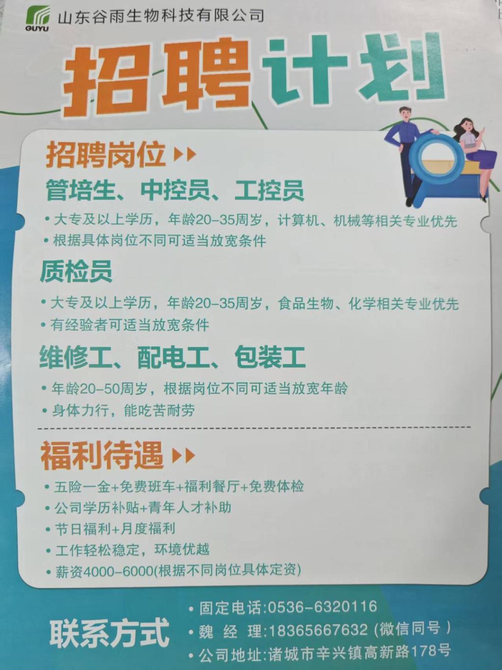 山东谷雨生物科技有限公司建设生态康健联产项目,形成玉米精深加工产品的能力。招聘质检员,要求食品生物、化学相关专业优先。