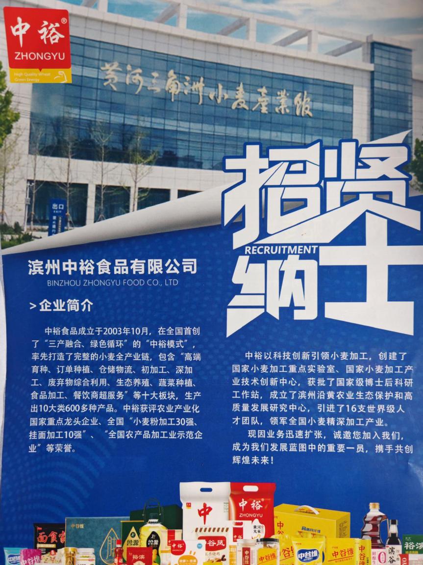 滨州中裕食品有限公司以科技创新引领小麦加工,创建了国家小麦加工重点实验室、国家小麦加工产业技术创新中心。招聘食品研发(5人)育种研发(5人),专业要求食品、生物工程农业、植物。
