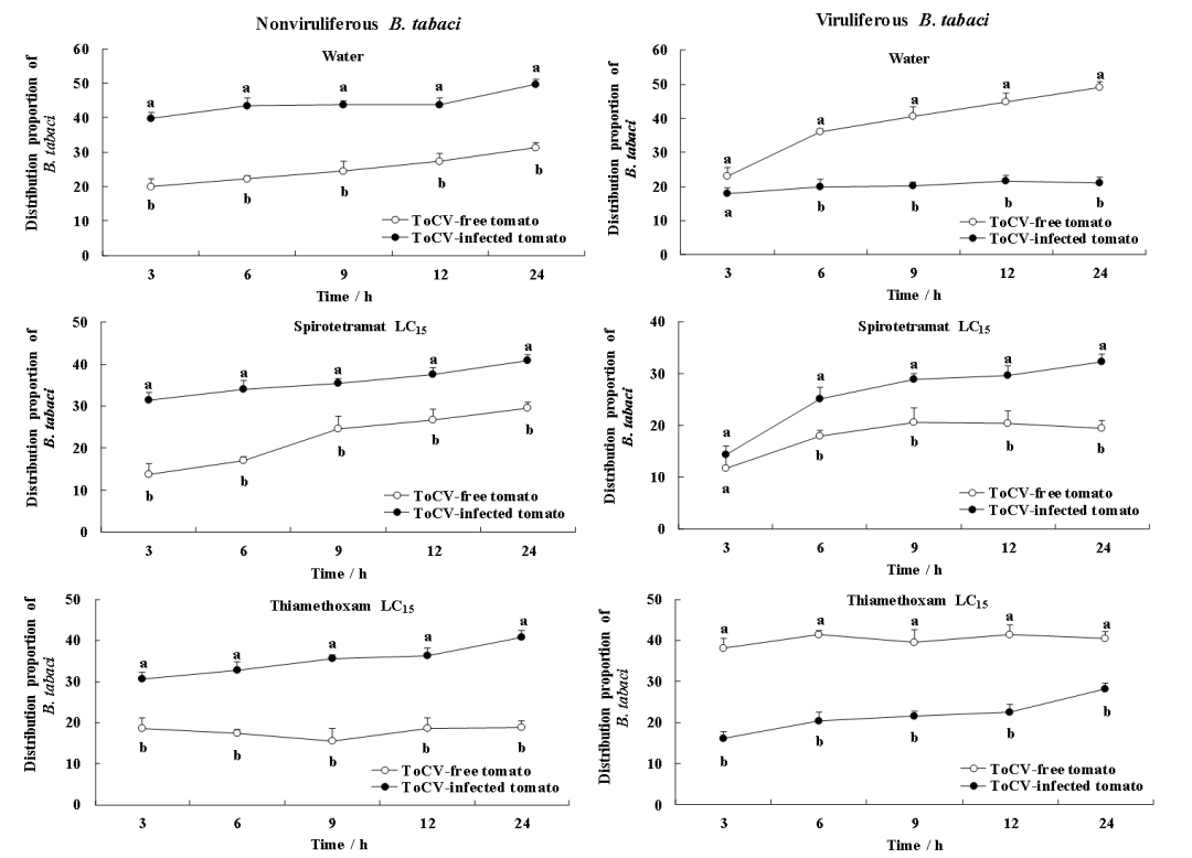 烟粉虱Bemisia tabaci (Gennadius)属半翅目 Hemiptera 粉虱科 Aleyrodiaae,是一种世界范围内大发生的高度杂食性“超级害虫”,给农业生产带来极大的经济损失。生产中通过施用杀虫剂控制烟粉虱种群数量,但不能有效控制病毒病的发生。本研究模拟田间用药后低致死浓度杀虫剂对烟粉虱传播植物病毒效能的影响,并进一步明确杀虫剂和植物病毒对烟粉虱寄主选择行为的联合作用。结果发现,烟粉虱携带病毒后对螺虫乙酯和噻虫嗪的敏感性显著降低,低致死浓度杀虫剂对烟粉虱获毒力无显著影响,但显著提高了烟粉虱传毒能力,且螺虫乙酯改变了带毒烟粉虱的寄主偏好。该研究丰富了媒介昆虫与植物病毒的互作理论,为田间有效防控番茄褪绿病毒病提供了新的见解。